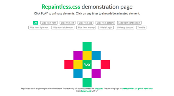تعتبر Repaintless CSS مكتبة CSS خاصة بالتحريك خفيفة الحجم تحوي عشرات المؤثرات التي تجعل الموقع أكثر فاعلية بدون التأثير على سرعته، حيث يمكنك إضافة مؤثرات الانزلاق بكل سهولة.